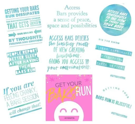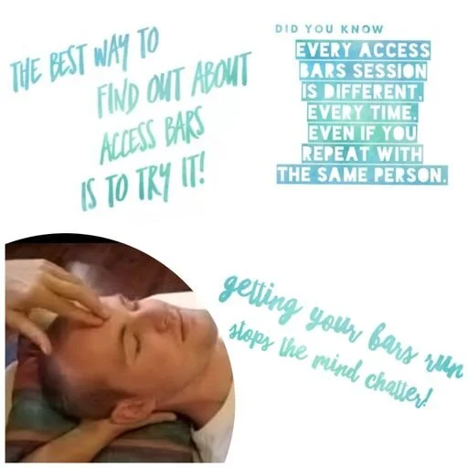 The Access Bars are 32 bars of energy that run through and around your head that connect to different aspects of your life. We call all of the points you touch when using this modality "The Bars."